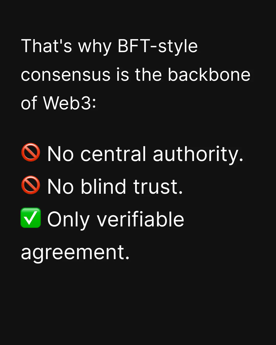 Each slide unpacks the Byzantine problem at the heart of decentralized consensus — and makes one thing clear: blockchains don't trust validators, they verify them. Because consensus isn't just a feature; it's the infrastructure that makes verifiable agreement possible without central authority or blind trust.