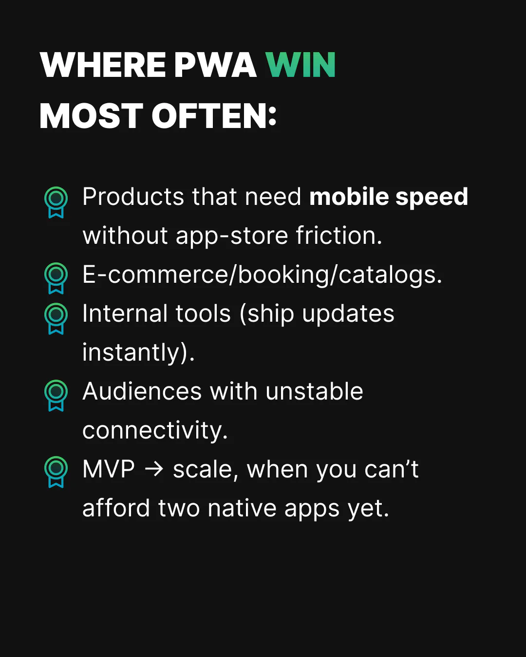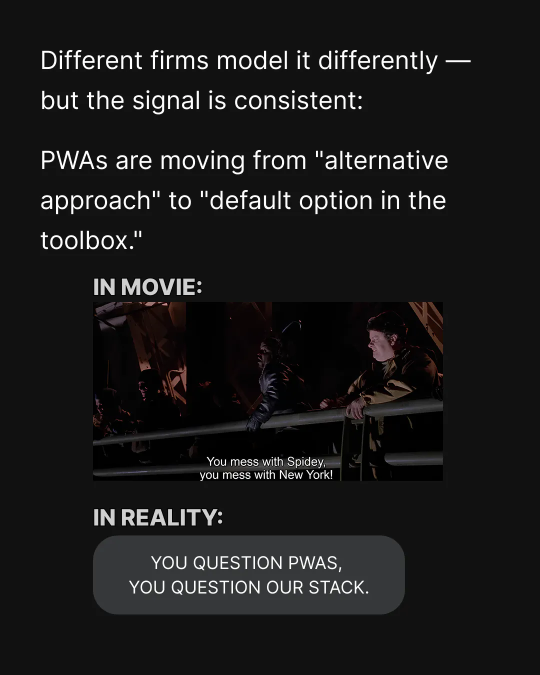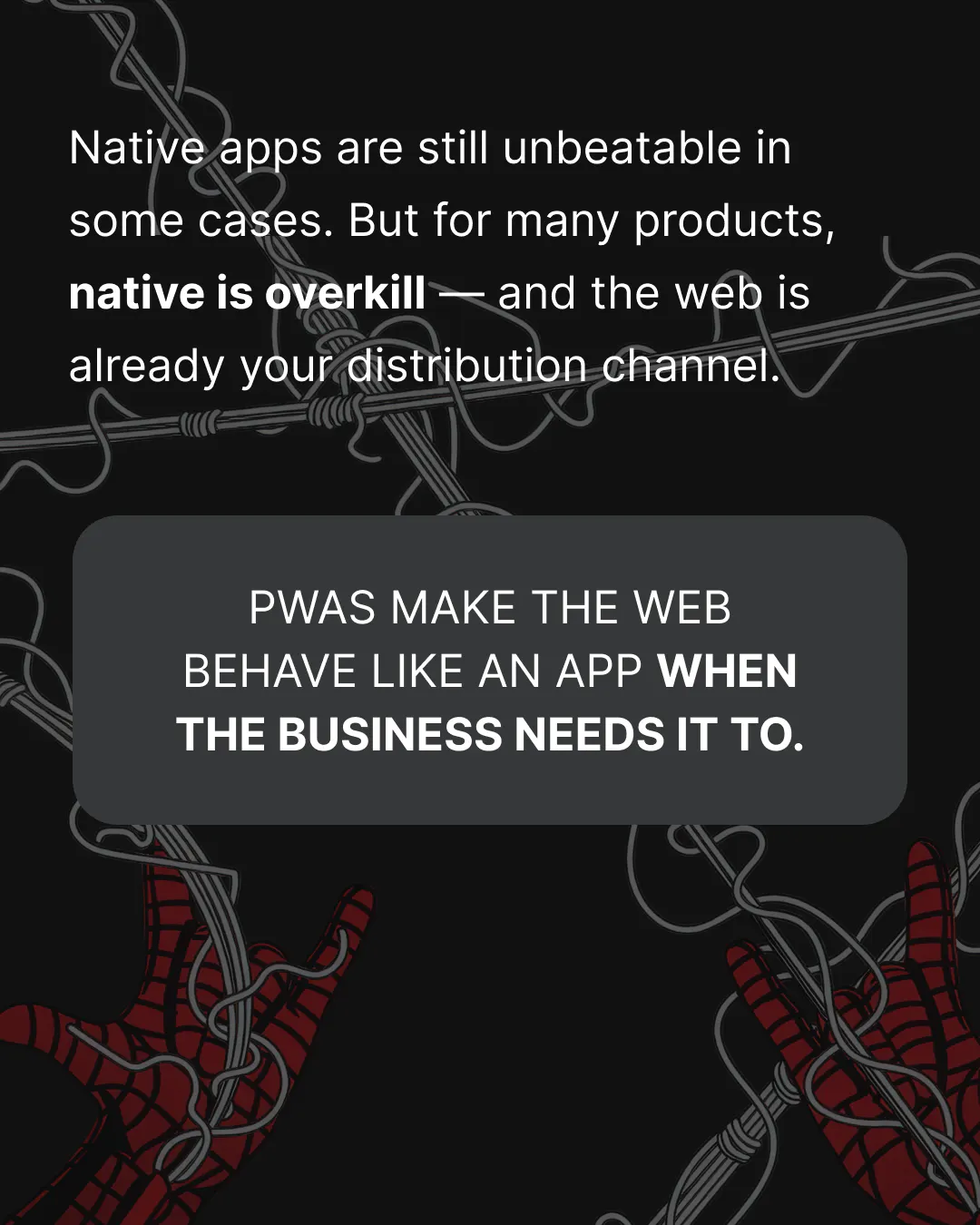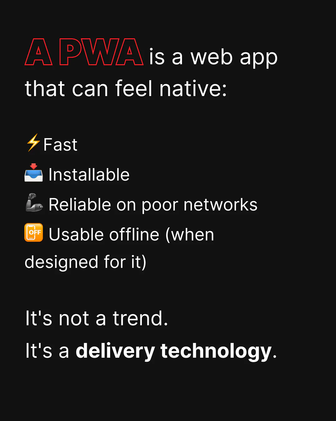 Each slide builds the case for why PWAs are a serious engineering choice: not a trend, but a delivery technology that gives you control over reliability when the network drops. The goal isn't to replace native apps – it's to make the web behave like an app when the business needs it to.