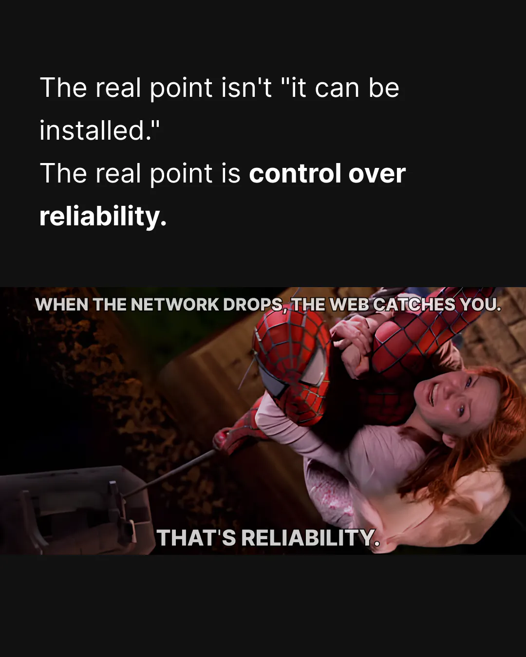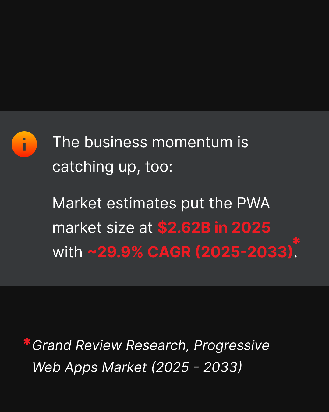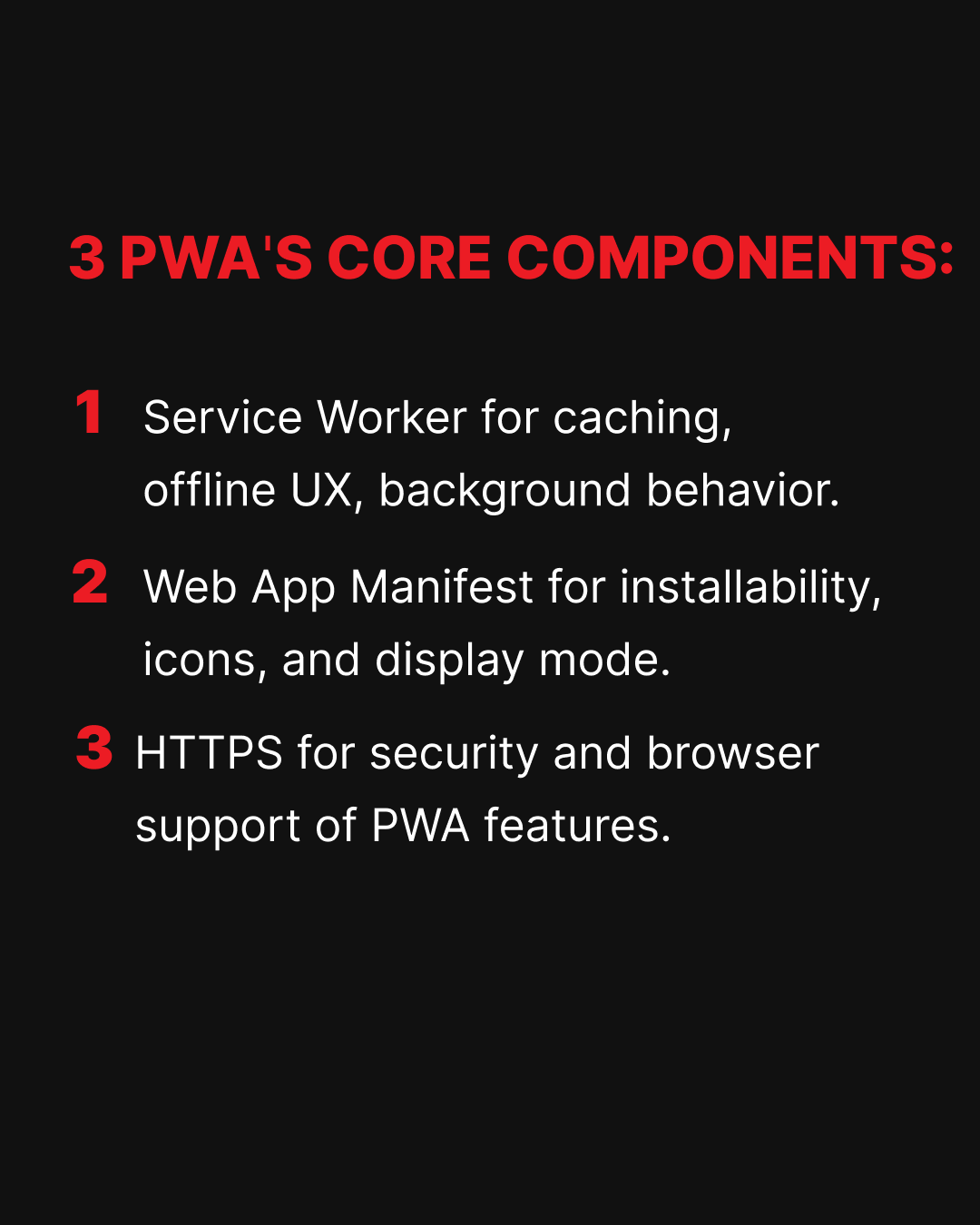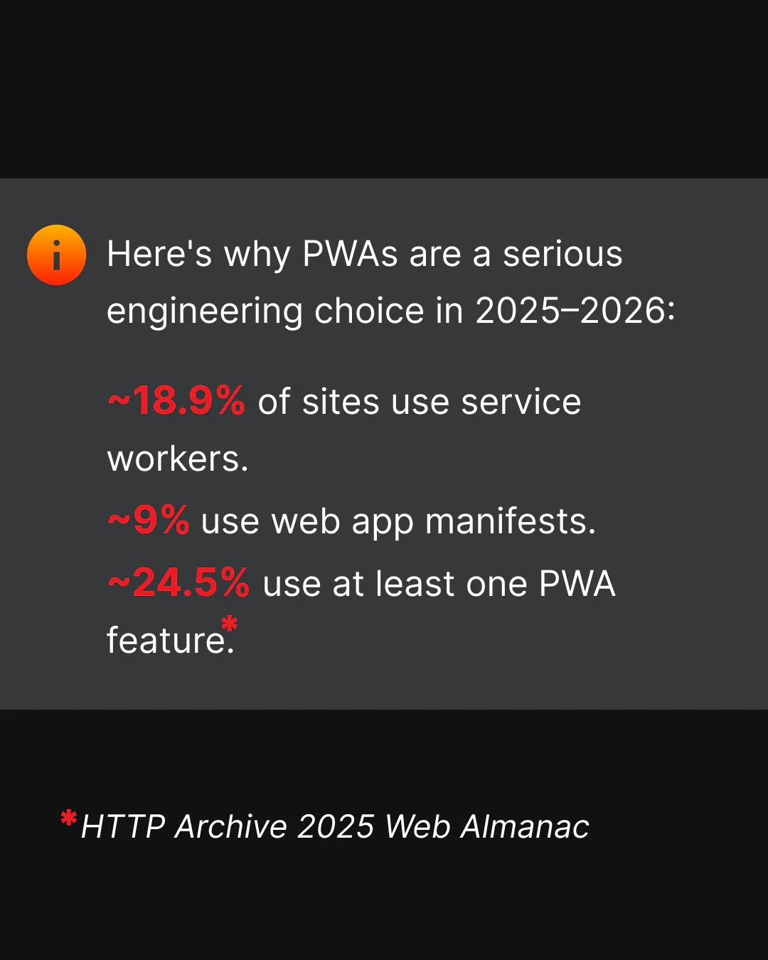 Each slide builds the case for why PWAs are a serious engineering choice: not a trend, but a delivery technology that gives you control over reliability when the network drops. The goal isn't to replace native apps – it's to make the web behave like an app when the business needs it to.